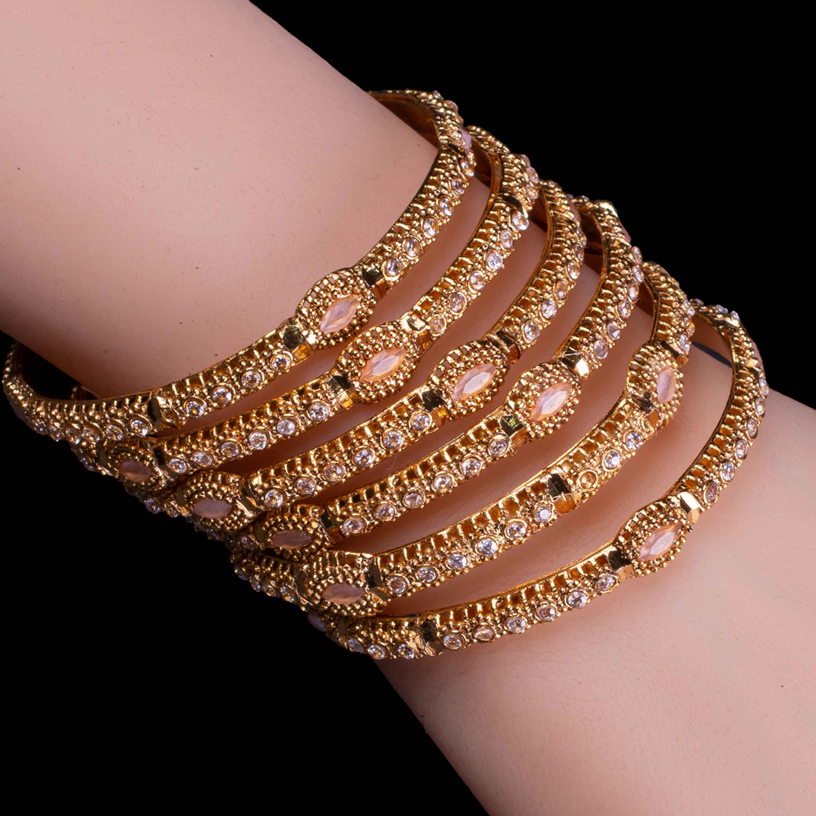 Elegant and refined 4-Pcs White Stone Antique Bangles Set. White Stone is perfect for anyone who loves classic accessories. The gold-plated sparkle paired with delicate white stones is suitable for festive clothes, weddings, or special meetings where your style stands out effortlessly.
