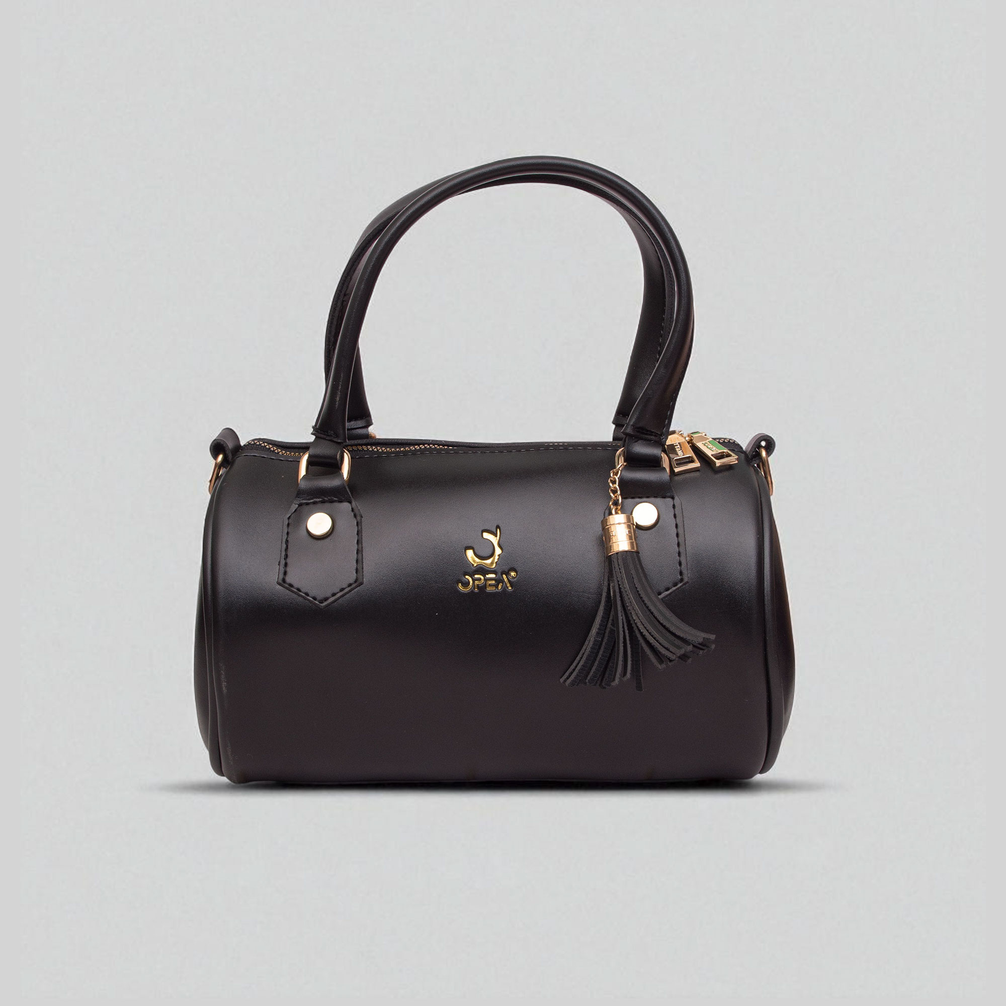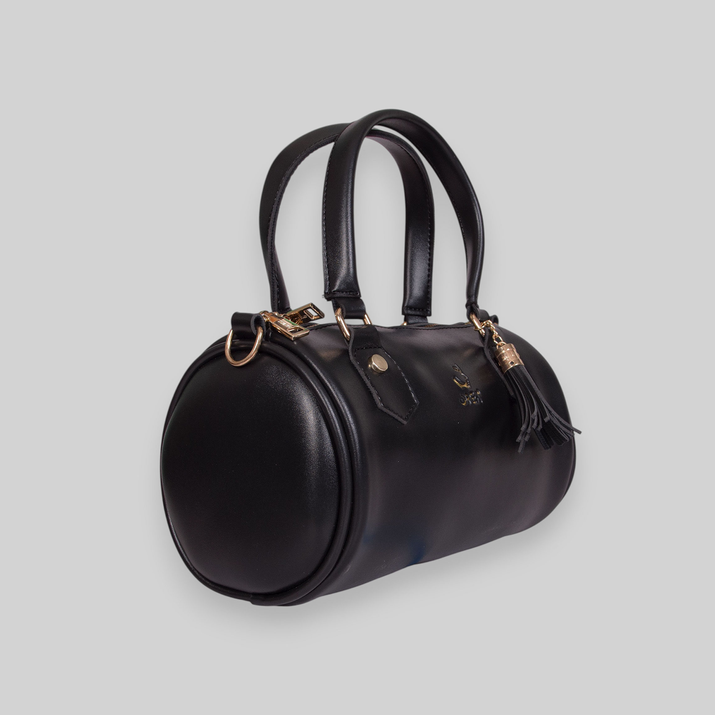 Tags: faux leather finish, top handles, Zipper top closure, Extra pocket inside, Barrel/Cylindrical design